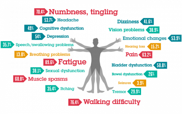 MS can cause a wide variety of symptoms, however most people with MS will experience only a few of these symptoms throughout the course of the disease. Some MS symptoms are more common than others, such as problems with vision, weakness or fatigue.